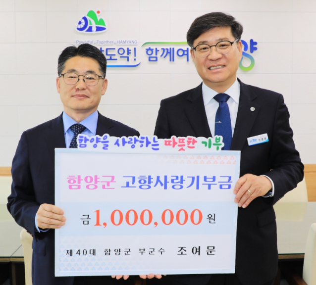 함양군, 조여문 전 부군수 명예군민증 수여 및 고향사랑기부금 기탁“함양 사랑 이어간다”…고향사랑기부금 100만 원 전달정호 기자 / |