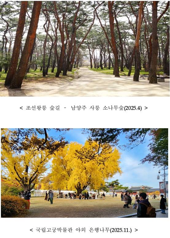 | 해마다 봄철 걷기 명소로 큰 인기를 끌고 있는 조선왕릉의 숲길도 올해 5월 16일부터 6월 30일까지 6주간 국민들에게 개방된다. 단종의 왕비 정순왕후가 모셔진 남양주 사릉의 능침 숲길을 비롯해, 세조와 정희왕후의 남양주 광릉 전나무 숲길, 구리 동구릉 숲길 등 9개 왕릉의 숲길을 걸을 수 있으며, 특히 올해는 파주 장릉 숲길의 경사 구간 계단을 정비하여 관람객의 안전과 편의성을 높였다. * 9개소: 구리 동구릉, 남양주 광릉, 남양주 사릉, 서울 태릉과 강릉, 서울 의릉, 화성 융릉과 건릉, 파주 장릉, 파주 삼릉, 여주 영릉과 영릉