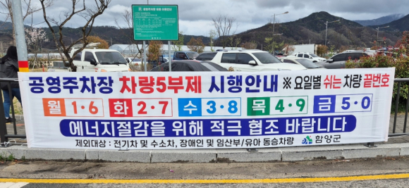 함양군은 정부의 에너지 절약 방침에 따라 대중교통 이용을 유도하기 위해 4월 8일부터 공영주차장 승용차 5부제를 시행한다고 밝혔다.