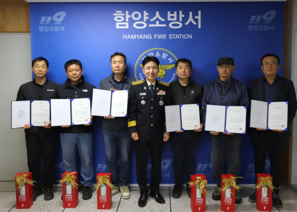 | 당시 화재는 생활폐기물 매립 쓰레기 약 100톤을 태우며 장시간 이어졌으며, 약 13시간 만인 다음날 새벽 2시 51분께 완전히 진화됐다. 표창 대상자는 함양군 건설교통과 공무직 송창용·김학현 조장과 민간 중장비 관계자인 경남건기 서성열·이상진·곽봉석·박문환 등 총 6명으로, 현장에서 중장비 지원과 신속한 대응을 통해 화재 확산 방지에 중요한 역할을 했다. 박해성 서장은 “화재 현장에서 보여준 신속한 지원과 협조에 깊이 감사드린다”며 “앞으로도 유관기관 및 민간과의 긴밀한 협력을 통해 군민의 생명과 안전을 지키는 데 최선을 다하겠다”고 말했다.