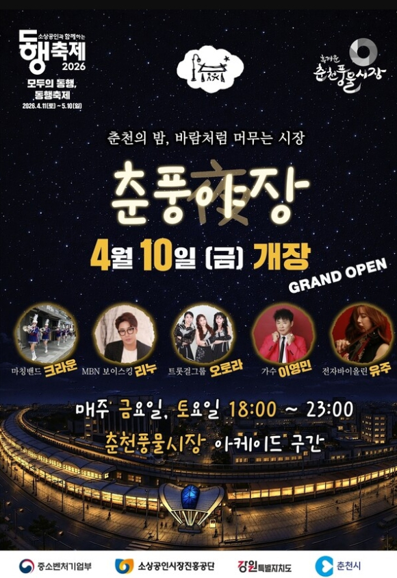 강원특별자치도, 춘풍야장 2.0 개장… 금‧토 밤, 춘천 풍물시장 달군다- 상반기 4.10.~6.13, 하반기 9.4.~10.10. 매주 금요일과 토요일 밤 운영- 버스킹‧공연 등 문화 콘텐츠 정례화 등 콘텐츠와 체류기능 강화한 야시장으로 도약 한용택 기자 / |