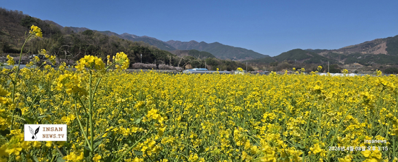 함양군 병곡면 가채마을 한켠에 소담하게 자리잡은 유채밭을 통해 본 풍경.