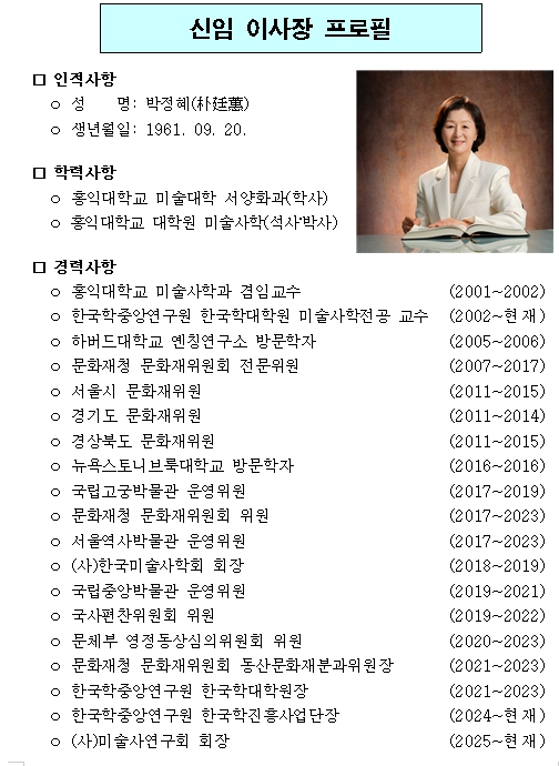 국외소재문화유산재단 제5대 이사장 임명- 국가유산청, 박정혜 한국학중앙연구원 한국학대학원 교수 임명 / 임기 ‘26.4.16.~’29.4.15.정호 기자 / |