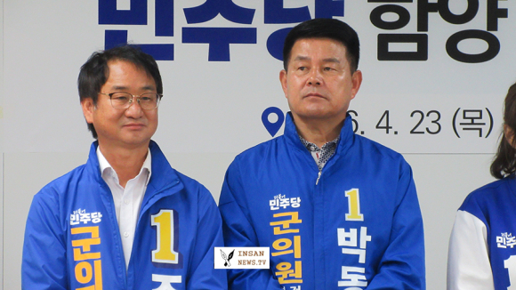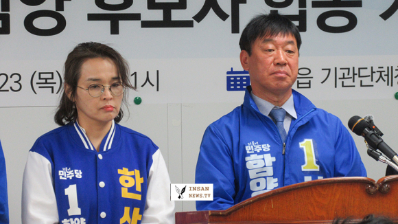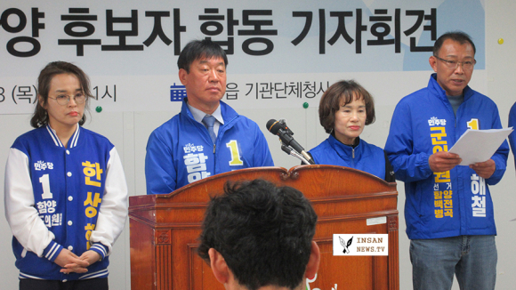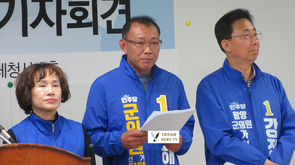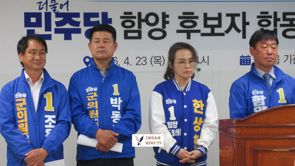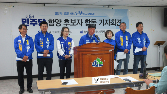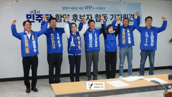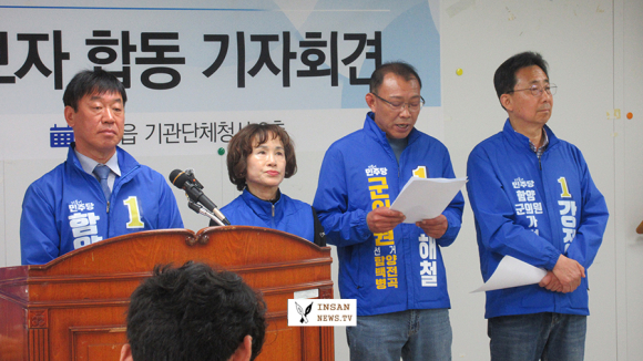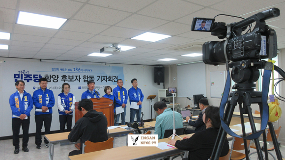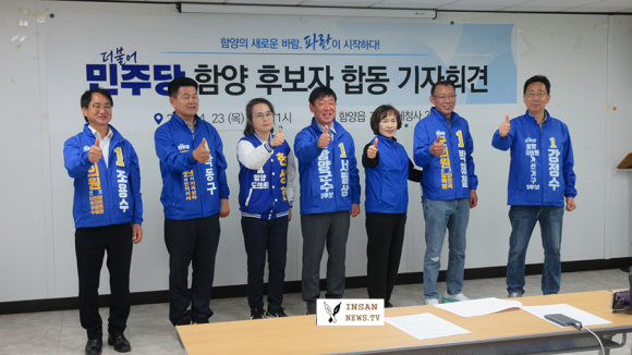 【더불어민주당】 함양후보7명 원팀 집권당정책공조 주장함양과 중앙부처와 경남도가 한팀이 되어 대혁신이루겠다더불어민주당 함양후보자 합동기자회견 김윤국 기자 / |