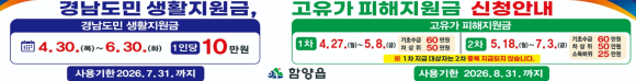경남도민생활지원금은 1인당 10만 원이며, 2026년 3월 18일 기준 함양군에 주소를 둔 전체 군민을 대상으로 4월 30일부터 6월 30일까지 신청할 수 있다. 2가지 지원금 모두 주소지 읍면 사무소로 방문하면 된다.