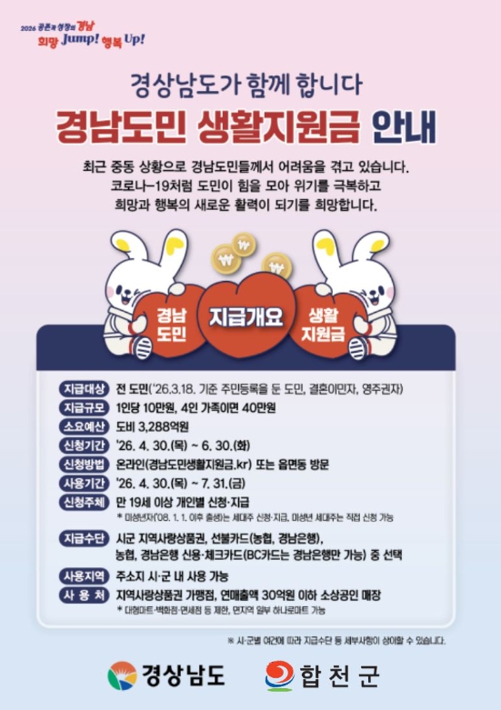 이번 생활지원금은 1인당 10만 원이 지급되며, 지급 대상은 3월 18일 기준 경상남도에 주민등록을 둔 전 도민으로 합천군의 지급대상자는 총 39,382명이다. 신청기간은2026년 4월 30일부터 6월 30일까지이며, 온·오프라인 모두 신청가능하다.