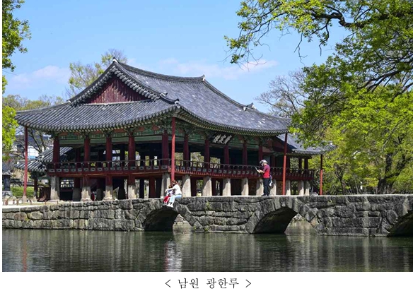 또한 광한루는 단순한 휴식 공간을 넘어 관리와 선비들이 교류하며 시문을 창작하던 관영 누각으로, 주변의 아름다운 풍광과 더불어 많은 문인들에게 영감을 제공한 공간이자 우리나라 조선시대 대표 판소리와 소설 ‘춘향전’의 배경이 된 건축유산으로 문화사적인 가치 또한 탁월하다.