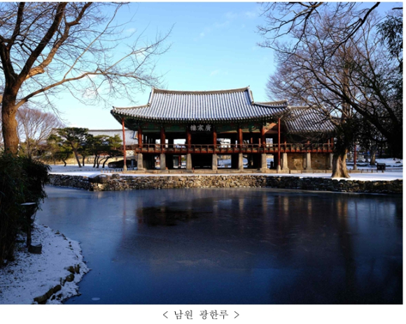 「남원 광한루」는 조선 후기 목조건축의 특징인 화려한 장식과 함께 익루의 온돌, 월랑의 계단 등 실용적 요소가 결합된 목조건축유산으로 건축사적 가치와 함께 명승으로 지정된 광한루원의 정원유적(庭園遺迹)과 어우러져 빼어난 예술적 가치를 가지고 있다.