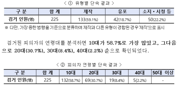 단속 대상은 정보통신망을 이용한 아동성착취물 제작 · 유포 · 소지 등 일체 행위로, 범행 유형별로는 아동성착취물 제작 범죄(133명 검거, 59.1%)가 가장 큰 비중을 차지했고 그다음으로 소지 · 시청 등(22.2%), 유포(18.7%) 순으로 나타났다.